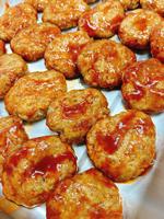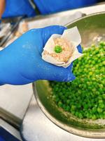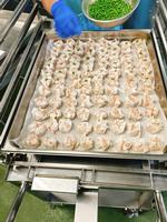 しゅうまいは、豚肉、豆腐、ねぎ、玉ねぎと調味料をよくまぜて、皮で包んで蒸しました。一人一個付けなので、大きなしゅうまいにしました。500個のしゅうまいは、きれいな形でおいしくできました。