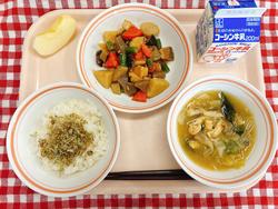 ごはん じゃこベーふりかけ 吉野煮 みそ汁 りんご 牛乳