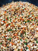 吹き寄せとは、秋に色づいた葉や花びらが風に吹かれて、一か所に集まった様子を表しています。鶏肉やにんじん、ごぼう、しめじ、しいたけなど、たくさんの具が入った季節の混ぜごはんです。薄く味をつけて炊いたごはんと、別で煮た具を混ぜ合わせ作りました。