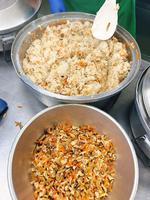 大量調理での焼きそばは、麺や野菜をそれぞれ蒸したりゆでたりして確実に温度が上がるようにします。また、量が多いと炒めにくいので、3回に分けて仕上げました。
