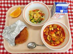 ハムとチーズのホイルサンドパン ポークビーンズ お揚げのサラダ オレンジ 牛乳
