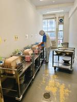 配膳室では、各クラスの食器やおぼんのセット、ダスターの準備などをしてくれています。ダスターは水ぶき用と消毒用と2枚。子どもたちも、すぐに配膳台や机をふくことができるのでとてもありがたいです。