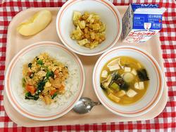 ジャージャー豆腐の生揚げは35kg使いました。油抜きをするため、一度ゆでてから肉みそと炒めました。ピリ辛だったので、ごはんがすすみました。6年生の教室では、体育大会の途中経過を放送で聞いて盛り上がっていました。