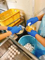 親子丼の卵は17kg使いました。ひとつずつ殻が入らないように割っていきます。