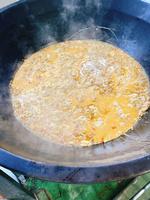 調味料を合わせ、みじん切りにしたしょうが、にんにく、ねぎを加えて火にかけます。万能ソースなので肉や魚にかけてもおいしいです。