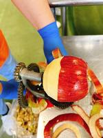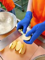 りんごは、山形県産のシナノスイートでした。皮は皮むき器でむいて、等分に分けたら芯をとっていきます。味が濃くておいしいりんごでした。