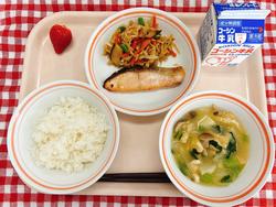 ごはん 鮭の西京焼き 切り干し大根の煮物 みそ汁 いちご 牛乳