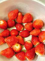 今日のいちごは、千葉県印旛郡の「とちおとめ」でした。いちごは、へたに汚れや土がついていることがあるので、へたをとってから洗います。520個のいちごのへたを一つひとつとり、優しく洗いました。今が旬のいちご!甘酸っぱくおいしかったです。