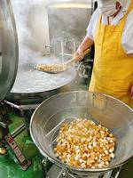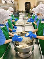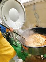 マーボー丼には、20kgの豆腐と10kgの生揚げを使いました。しっかり加熱されて煮崩れないように、あらかじめゆでてから具と合わせました。
