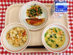 たけのこごはん すずきのフライ もやしとほうれんそうのピリッとあえ かきたま汁 牛乳
