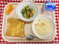 セサミトースト クラムチャウダー ひじきサラダ きよみオレンジ 牛乳