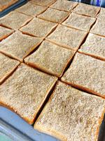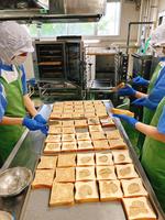 セサミトーストは、ねりごま、すりごま、いりごま、砂糖、マーガリンを混ぜ合わせ食パンにぬり、オーブンで焼きました。520枚のパンを焼くのに時間がかかりますが、ごまをすみずみまで丁寧にぬってくれました。ごまには良質な油やカルシウム、鉄分、食物繊維などがたくさん含まれています。栄養価が高いごまをたくさん食べることができました。