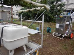 小雨が降る中、大橋小学校の梨畑の土壌消毒がおこなわれました。梨農家の方と東葛飾農業事務所から3名が来校してくださいました。消毒の機械は県内に2台しかないそうです。農薬は使わず、50度の温水でモンパ菌を消毒しました。