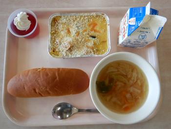 今日の給食はハロウィンメニューでした。ハロウィンは10月31日ですが、明日は音楽部が音楽祭に参加し給食が食べられないので、今日がハロウィンメニューでした。献立は黒糖パン、パンプキングラタン、白菜とベーコンのスープ、手作りぶどうゼリー、牛乳です。
