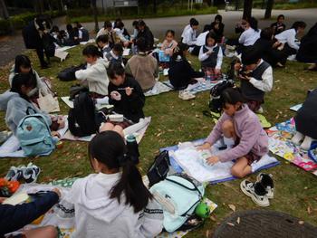 午前中の部が終わり、昼食です。外の芝生で食べました。大橋小は出番が終わっているのでリラックスモードでした。