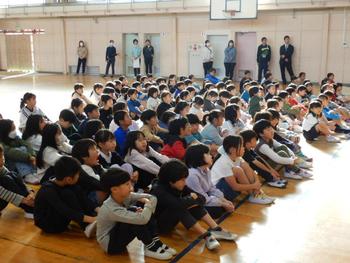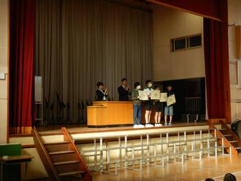11月の全校朝会の様子です。まず、表彰をおこないました。歯のきれいな6年生4名が表彰されました。