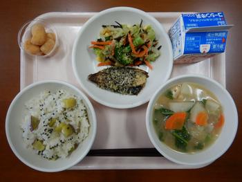 そして、今日の給食は千葉県産の野菜がたくさん入った千産千消メニューでした。さつまいもごはん、いわしの和風パン粉焼き、ひじきサラダ、千葉の野菜みそ汁、白玉きなこ、牛乳です。