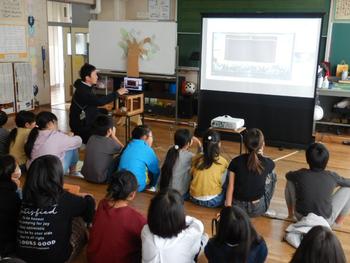 スクリーンには発表を聞いている東郷小の様子が写っています。