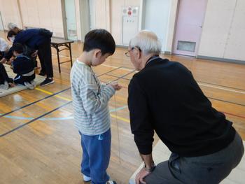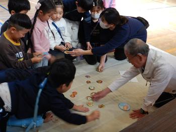 今日は1年生が生活科の学習で昔遊びの授業をおこないました。大橋町会大成会の皆様が先生役となり、遊び方を教えていただきました。たくさんの方が来てくださいました。