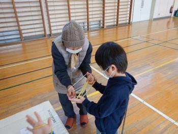 こまコーナーです。ひもの巻き方を教えてもらっています。