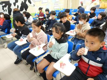 集合写真を撮ったあと、1号車と2号車に分かれての見学です。1号車はまず牛乳とヨーグルトを試食しました。2号車は工場見学からです。