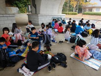 工場を出発し、21世紀の森と広場に行きました。小雨が降っていたので、屋根のある場所でお弁当を食べました。