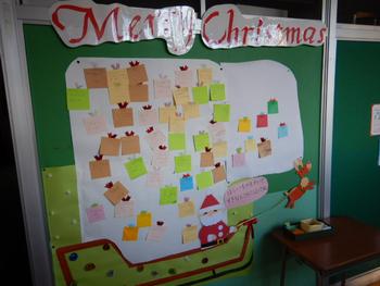 図書室前の廊下にはサンタさんへのお願いがいっぱいになったので、袋がさらに大きくなりました。