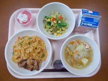 今日は2学期最後の給食でした。献立は、ベーコンのピラフ、ローストチキン、オニオンドレッシングサラダ、野菜スープ、クリスマスゼリー、牛乳です。