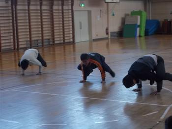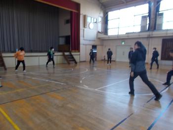 子どもたちが下校したあと、先生方で体育の研修をおこないました。まずはけがをしないよう、準備運動です。張り切り過ぎてけがをするパターンが多いので準備運動は大切です。
