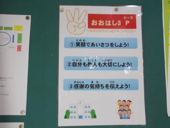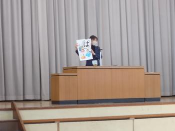 また、スリーピースのピースには平和とか安心という意味があり、この三つのことがあたりまえにできるようになると、みんなが幸せな学校生活を送ることができるのだと話しました。