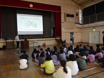 昨日、4年生が講師を招いて福祉の体験学習をしました。はじめにスライドで福祉とは何かということを学びました。
