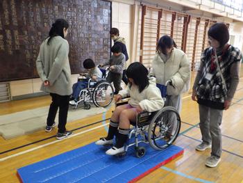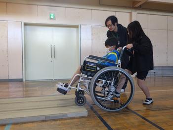 まず、車いすを体験しました。車いすに乗ったりと押したりする体験を通して、困り感や配慮すべきことを学びました。