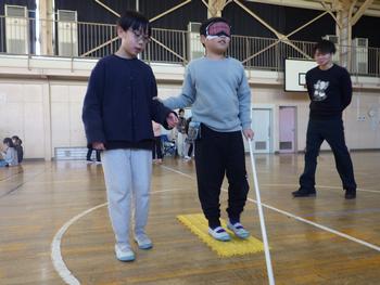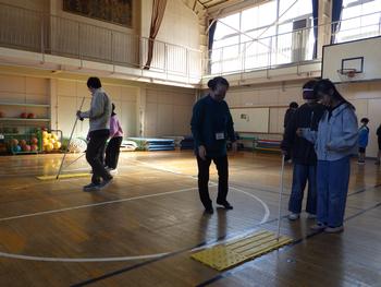 また、アイマスクと白杖を使い、視覚障害の疑似体験をし、障害のある方が安心できる接し方を学びました。