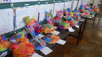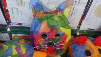 午後、2年生の教室に行くと、廊下にお面が飾ってありました。