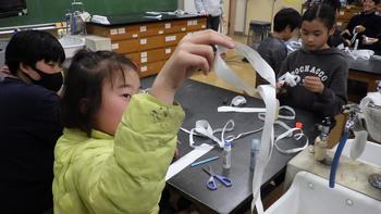 理科クラブです。「メビウスの輪」を作って、表と裏の不思議を体験していました。