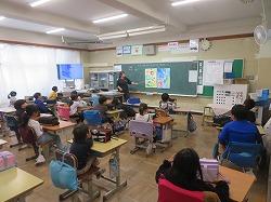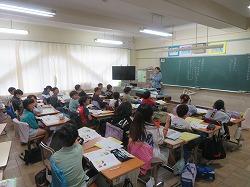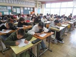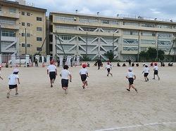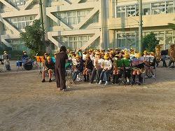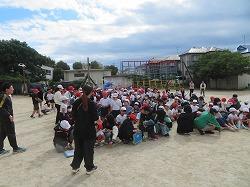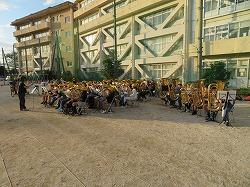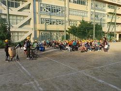 体育館がエアコン設置工事のため使えないため、今月30日の小中学校合同音楽会に向けての全体練習を校庭で行っています。