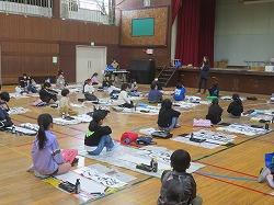 今日は1,2時間目に4年生が、3,4時間目に3年生が体育館で書き初め大会をしました。