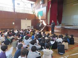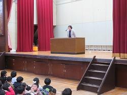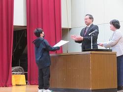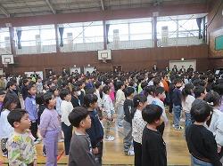 体育館での始業式の前にバドミントンの全国大会で優勝した子の表彰を行いました。