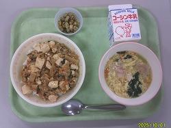 献立:麻婆丼、玉子スープ、ポップビーンズ、牛乳