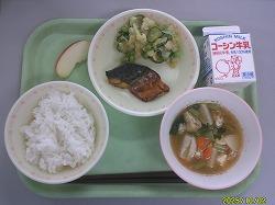 献立:ごはん、サバの甘辛焼き、カブの味噌汁、枝豆サラダ、リンゴ、牛乳