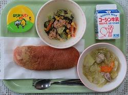 献立:きな粉揚げパン、ポトフ、ひじきサラダ、はちみつレモンゼリー、牛乳