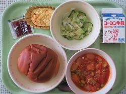 献立:テーブルロール、イチゴジャム、ポークビーンズ、グリーンサラダ、スイートポテト、牛乳