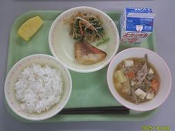 献立:ごはん、赤魚の西京焼き、豚汁、小松菜ともやしの胡麻和え、パインアップル、牛乳