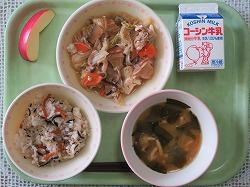 献立:ひじきごはん、すき焼き風煮、味噌汁、リンゴ、牛乳