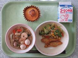 献立:カントン麺、ワカサギのフリッター、ブロッコリーサラダ、ブルーベリーマフィン、牛乳