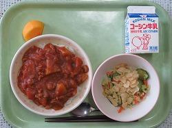 献立:ハヤシライス、ポテトチップスサラダ、柿、牛乳