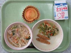 献立:かき玉うどん、きびなごカリカリフライ、そくせき漬け、米粉のマドレーヌ、牛乳