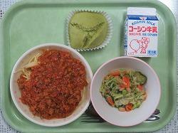 献立:スパゲッティミートソース、ビーンズサラダ、抹茶蒸しパン、牛乳