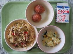 献立:キャベツのペペロンチーノ、ジャーマンポテト、とうふドーナッツ、牛乳