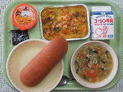 献立:コッペパン、チョコクリーム、カボチャグラタン、アルファベットスープ、パンプキンババロア、牛乳